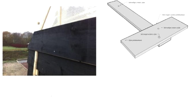 Wie potdekselt moet er bij de onderste plank er op letten eerst een onderlat te plaatsen net zoals op het dak de onderste panlat een dubbele panlat geplaatst moet worden. Anders ligt de onderste plank plots niet schuin zoals de rest. De hoeken is het makkelijkst, nauwkeurigst en snelste te maken door een lat op de kopse kant te schroeven en hier tegenaan te potdekselen. Dit ook voor de zijde waar de lat nu momenteel zit.